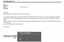V spoločnosti Draxton Brno máme nainštalovaných niekoľko riešení od firmy Format 1. Ide ako o prejazdovú váhu pre kamióny, tak aj o riešenie prispôsobené priamo našej prevádzke (váhy VZV pre distribúciu tekutého kovu, druhovacie žeriavy a pod).