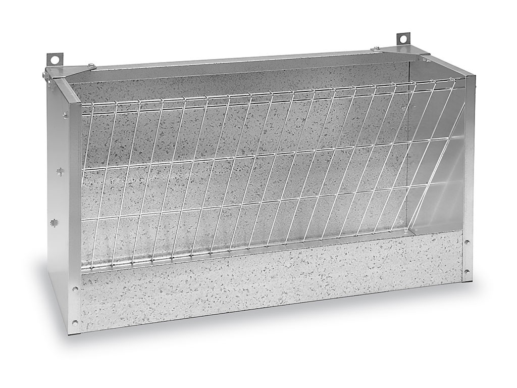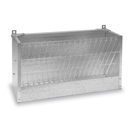 Jasle na seno, pre ovce a kozy, z pozinkovaného plechu, so zadným panelom, montáž na stenu, so zbernou vaňou, rozmery 98x36x52 cm.