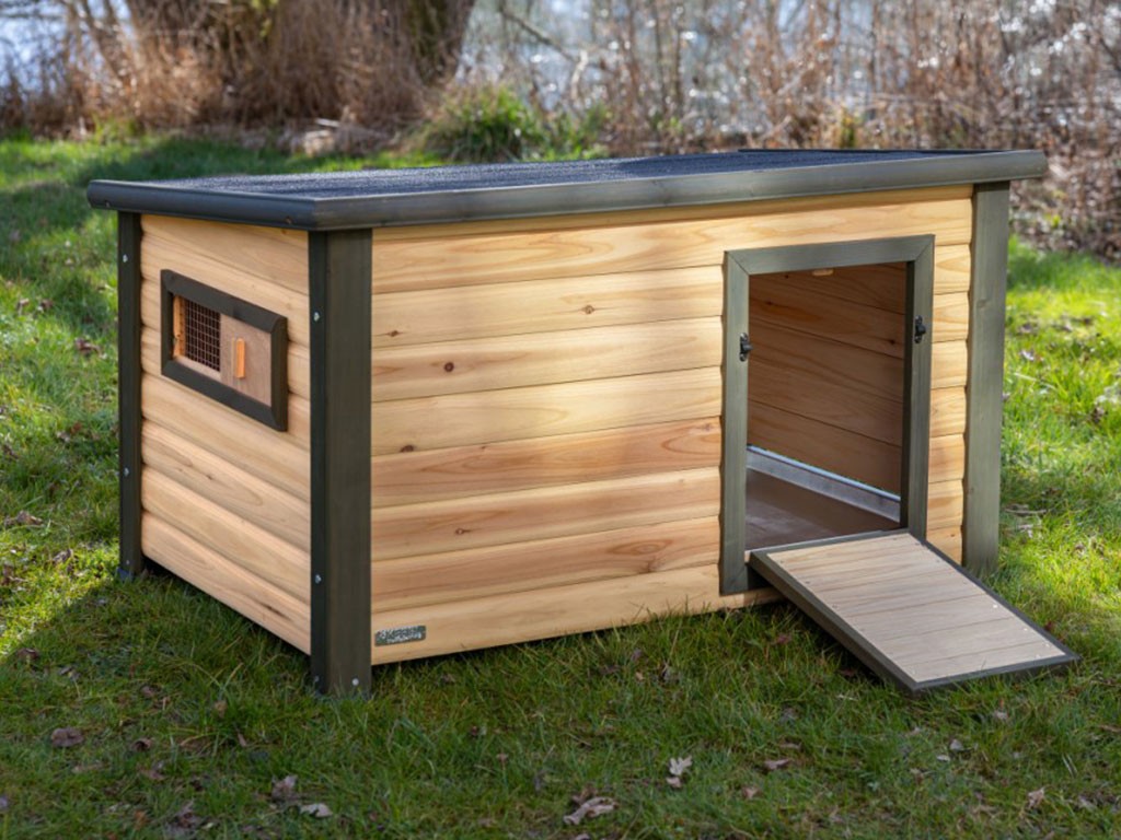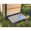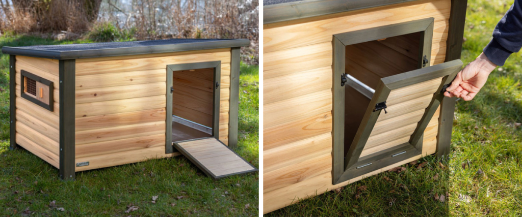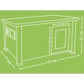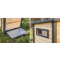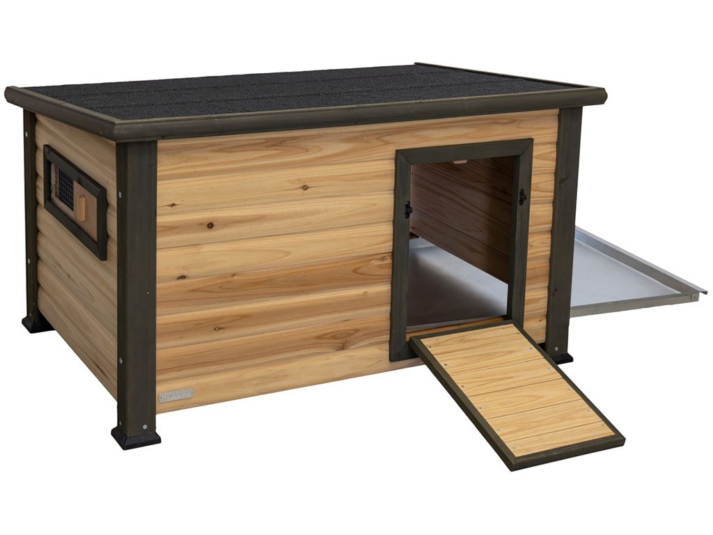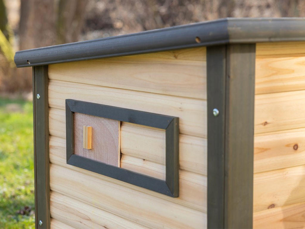 Domček pre kačice a husi, z odolného smrekového dreva, nohy zaisťujú vysokú stabilitu, s uzatvárateľnými dvierkami, s bočným okienkom, výsuvný trusník pre ľahké čistenie, rozmery 115x77x67 cm.