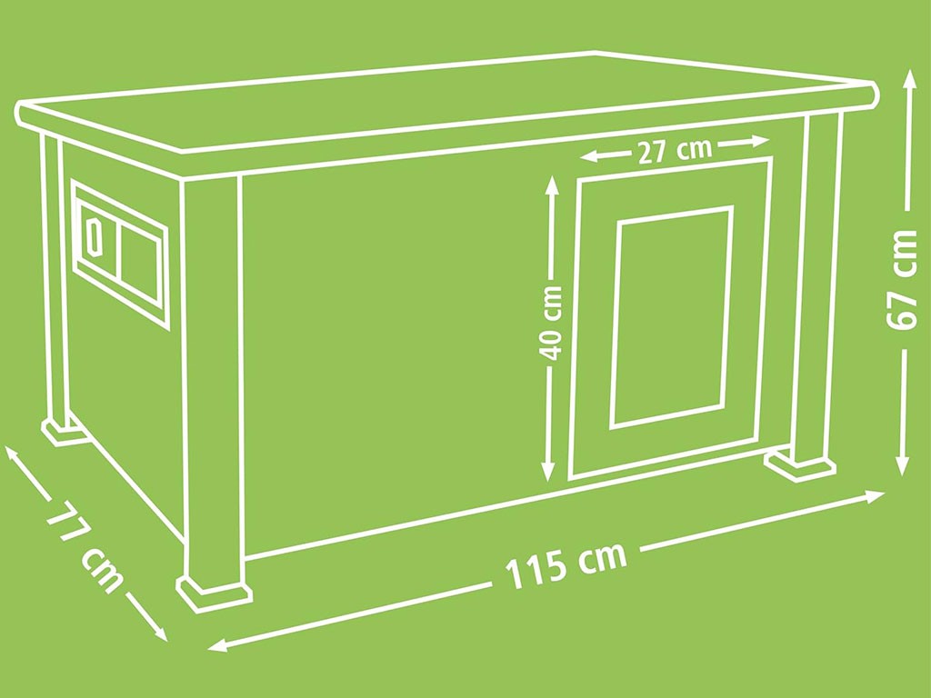 Vonkajšie rozmery celého kačice sú 115x77x67 cm, a tak poskytne dostatok priestoru pre vaše kačice a husi. Rozmery dvierok kačača sú 27x40 cm.