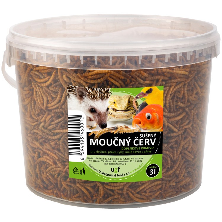 Larvy sušeného múčneho červa sú 100% prírodné doplnkové krmivo vtákov, rýb, jašteričiek, leguánov, korytnačiek, žiab, ježkov, škrečkov, myší, potkanov a iných malých cicavcov, mačiek a psov.