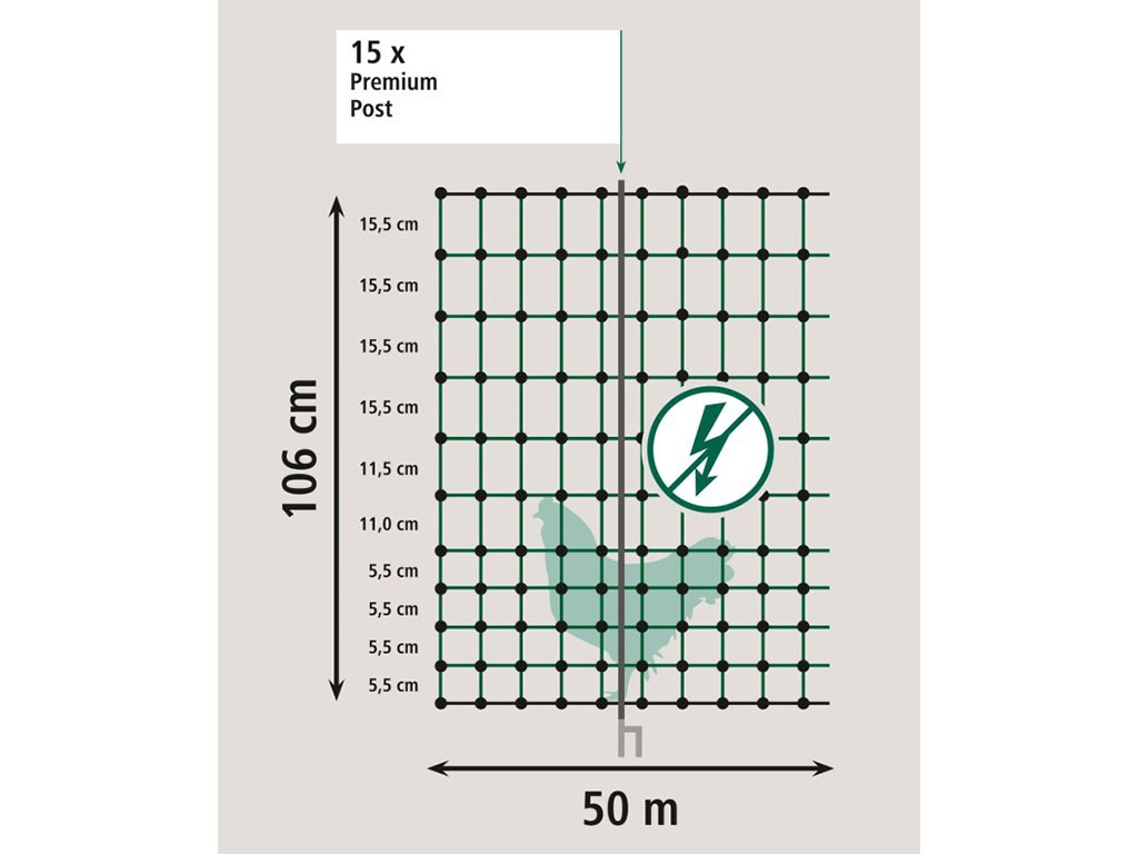 Ohradníková nevodivá sieť pre hydinu, 15 PREMIUM sklolaminátových tyčiek, 4 kotviace háky, dvojitý pozink. hrot, menšia veľkosť ôk v spodnej časti, výška 106 cm a dĺžka 50 m.