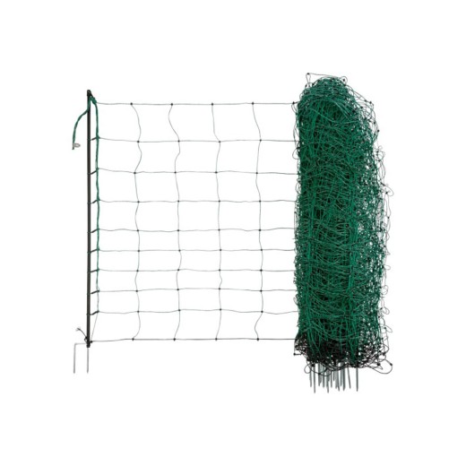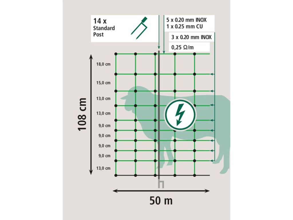 Ohradníková vodivá sieť pre ovce, pre konštrukciu elektrického ohradníka, 10 vodorovných prameňov, zosilnený horný prameň až so 6 vodičmi, spodný prameň bez vodiča, ostatné vodorovné pramene s 3 vodičmi, 14 plastových tyčiek s dvojitým hrotom, pevne zvarené spoje a odolné za 0.