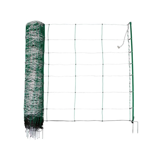 Sieť pre elektrický ohradník pre ovce , 8 vodorovných vodičov, zosilnený horný prameň, robustné plastové tyčky s 2 hrotmi, extrémne stabilné zvárané uzly, kombinácia medených a nerezových drôtov, zvýšená vodivosť, výška 108 cm a dĺžka 50 m.