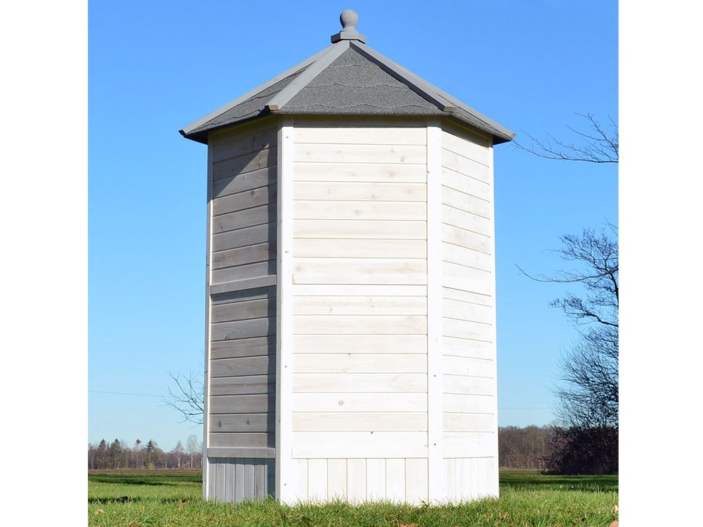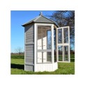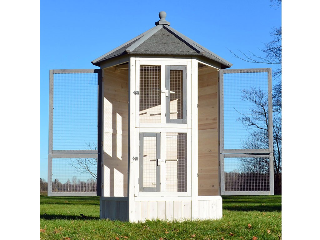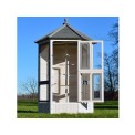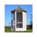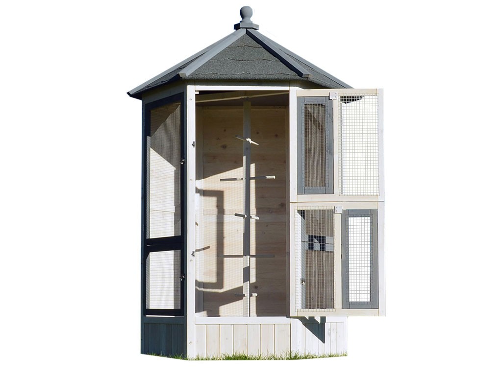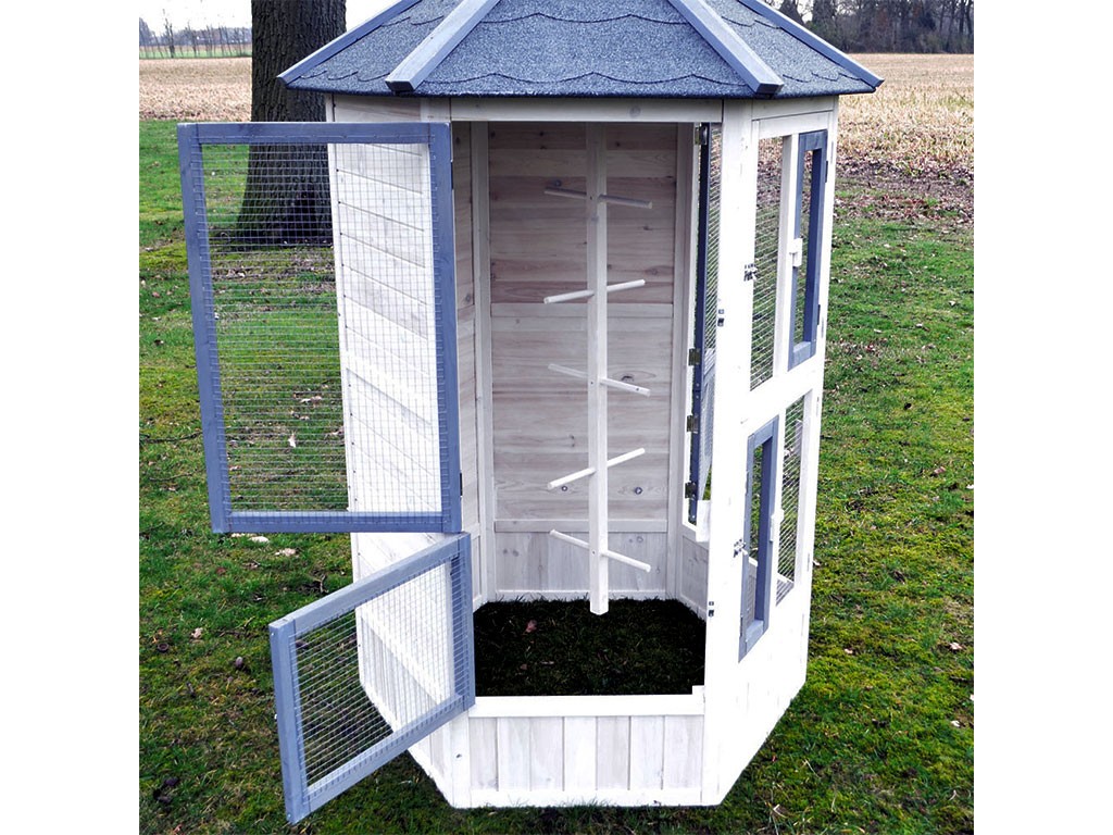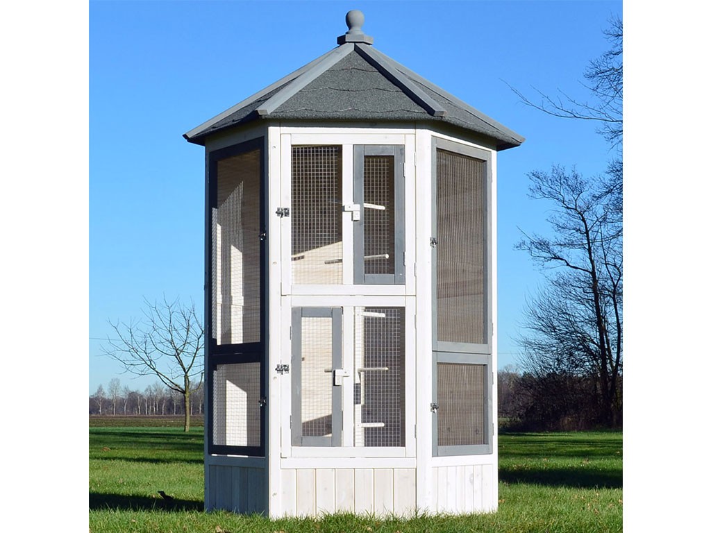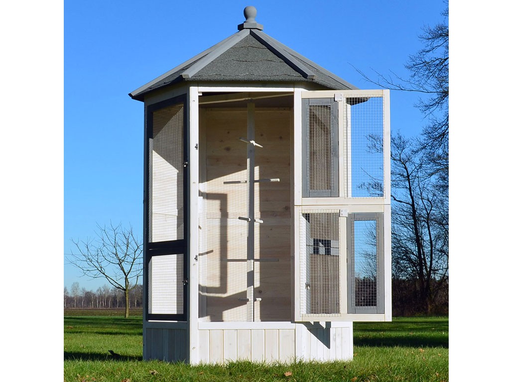Voliéra pre vtáky z masívu, lakované borovicové drevo, bitúmenová strecha, 6 otvárateľných dvierok, 5 bidiel na závesnej hrazde, štýlová biela farba, rozmery 100x100x183cm.