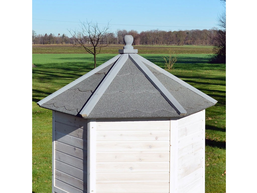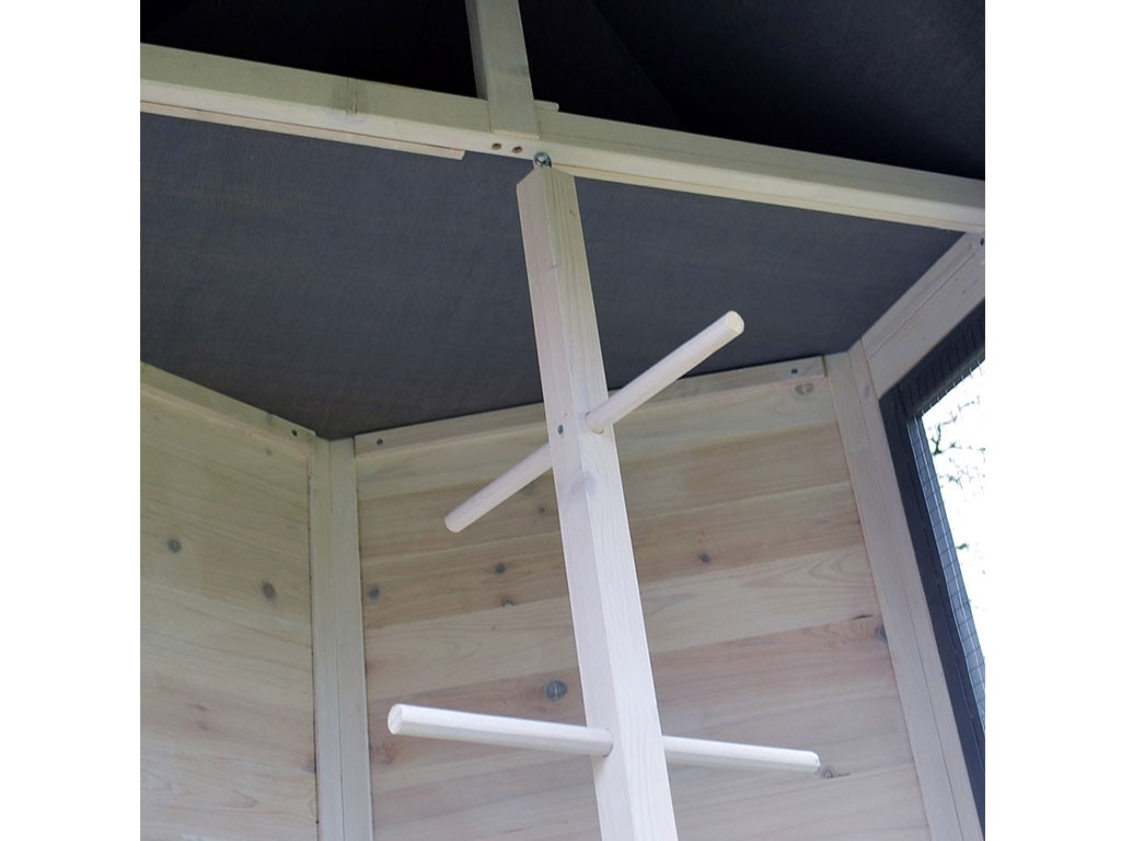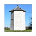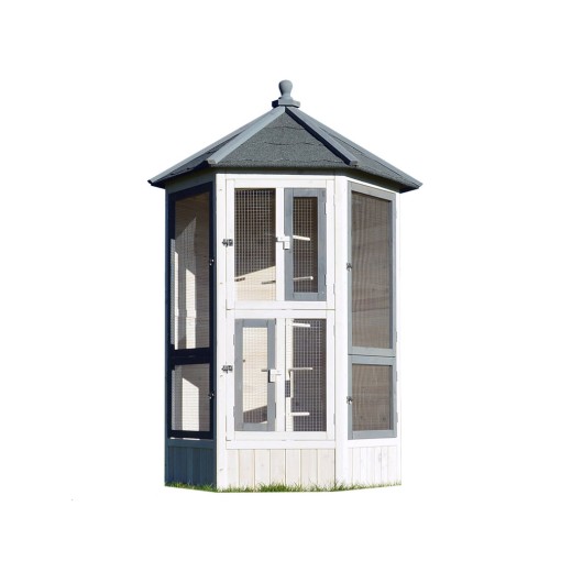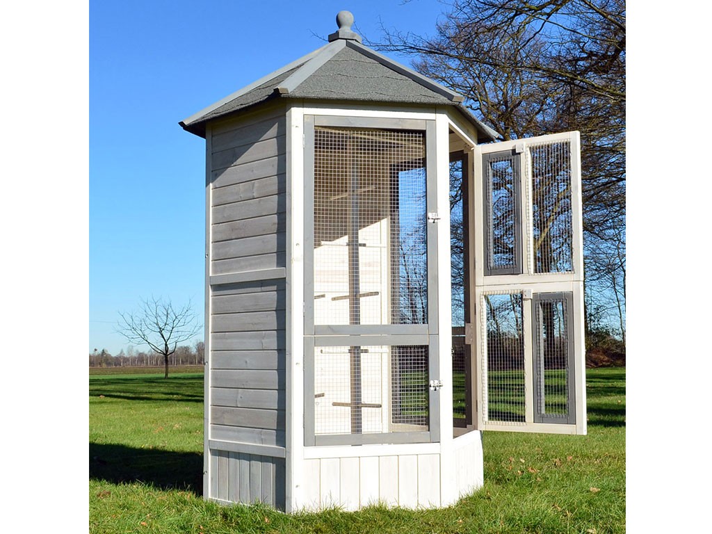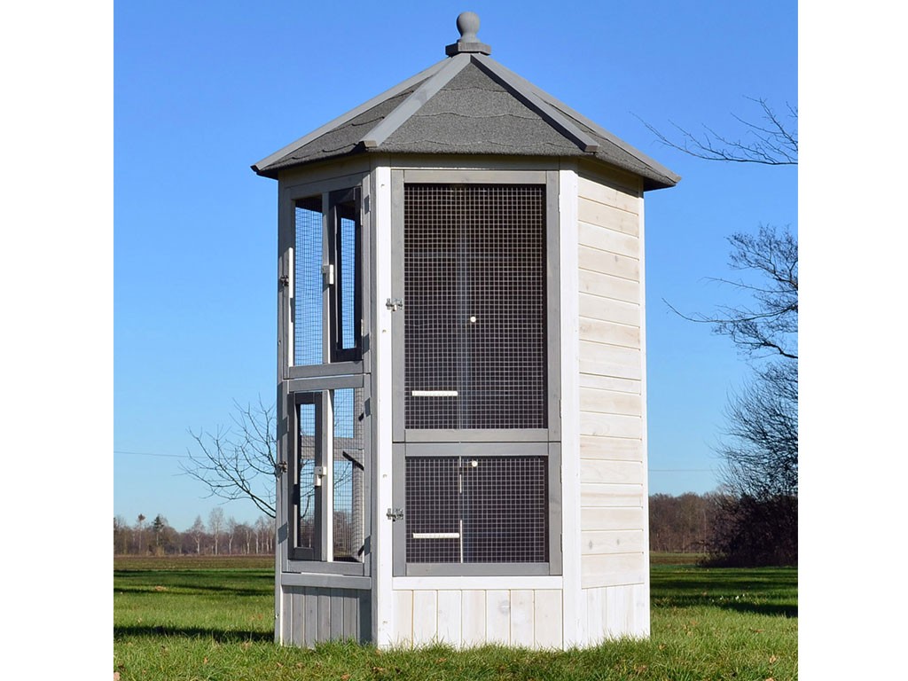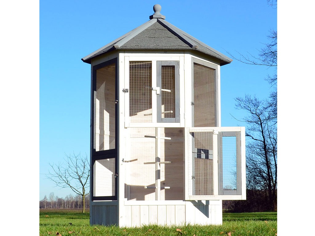 Voliéra s rozmermi 100x100x183 cm má dostatok priestoru pre veľkého papagája aj viacerých menších vtáčikov. Je vyrobená z odolného borovicového dreva, ktoré je navyše chránené náterom v atraktívnej bielej farbe a môže tak zdobiť nielen Vašu terasu, ale aj záhradu. Odolná bitúmenová strecha ochráni vtáky pred dažďom aj slnkom. Vnútri voliéry sa nachádza závesná hrazda dlhá 115 cm s 5 bidlami, ktoré poskytnú vtákom dostatok priestoru na odpočinok.