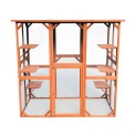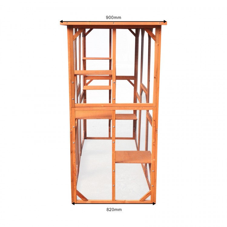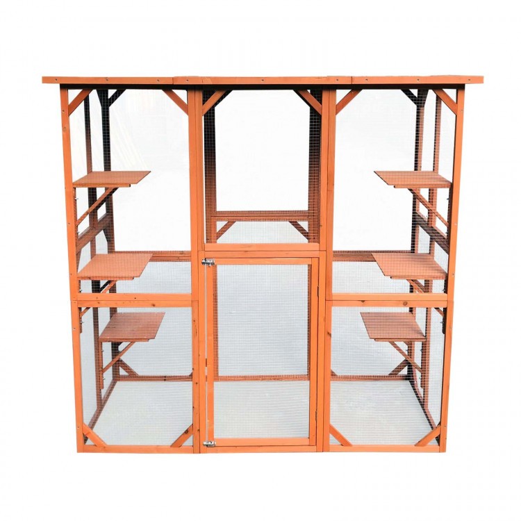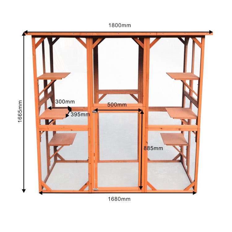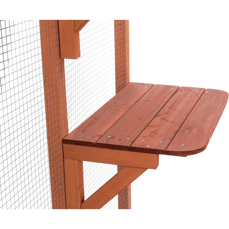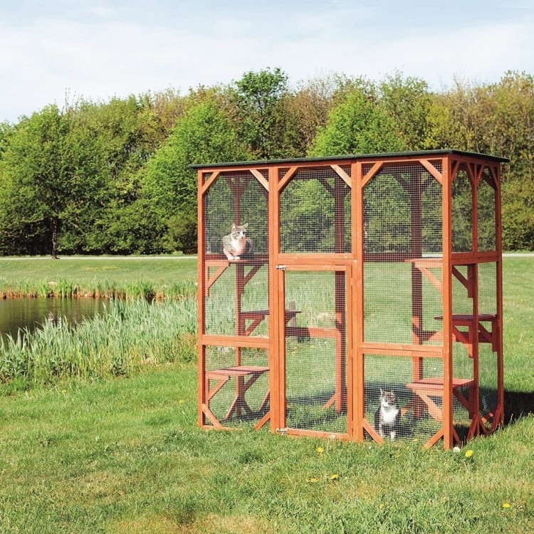 Tento praktický vonkajší výbeh umožňuje vašim domácim mačkám pobehovať na čerstvom vzduchu bez rizika úteku. So svojimi priestrannými rozmermi 180 x 88 x 169 cm je výbeh vhodný najmä na inštaláciu na záhrade, dvore alebo terase. Výbeh je vyrobený z jedľového dreva s vodoodpudivou úpravou s pevným drôteným pletivom z pozinkovanej ocele a strechou odolnou proti poveternostným vplyvom s bitúmenovým náterom, takže ani dážď, sneh a silné slnečné žiarenie nie je problém. Výbeh má šesť ležadiel, z ktorých môžu Vaše mačky pozorovať okolie a relaxovať. Vďaka predvŕtaným otvorom a presnému montážnemu návodu je možné výbeh zostaviť rýchlo a ľahko. Výbeh má tiež dvierka, ktoré je možné zamknúť zvonku.