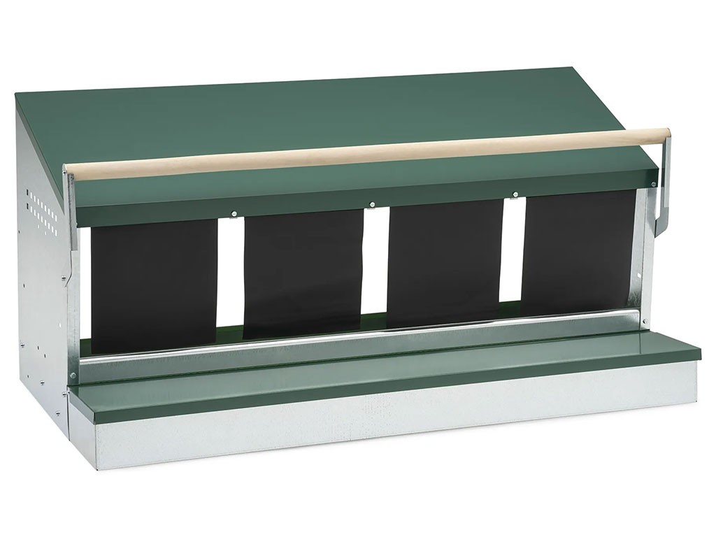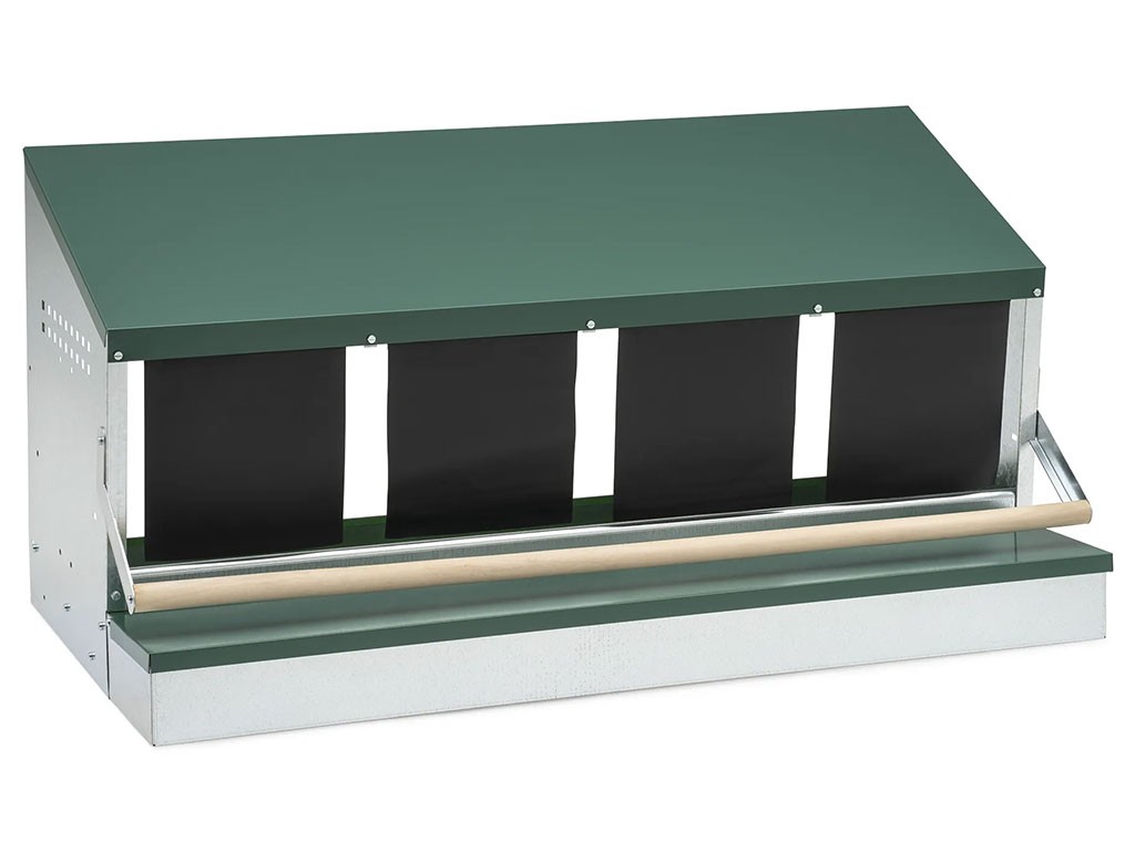 Znáškové hniezdo pre sliepky s bidlom a zberným košíkom, štvormiestne , kapacita až 20 nosníc (5 nosníc na jednu kukaň), vyrobené z odolného kovu a plastu, farba zelená . Hniezdo môžete jednoducho postaviť v kurníku na zem alebo zavesiť na stenu , veľmi ľahká údržba čistoty, rozmery: 51,5 cm dĺžka x 106 cm šírka x 51 cm výška.