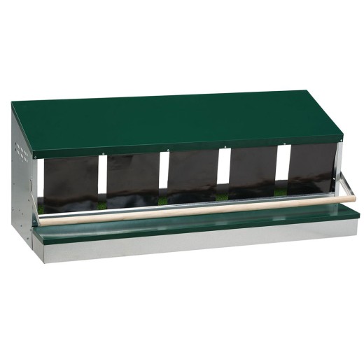 Znáškové hniezdo pre sliepky s bidlom a zberným košíkom, päťmiestne , kapacita až 25 nosníc (5 nosníc na jednu kukaň), vyrobené z odolného kovu a plastu, farba zelená . Hniezdo môžete jednoducho postaviť v kurníku na zem alebo zavesiť na stenu , veľmi ľahká údržba čistoty, rozmery: 51,5 cm dĺžka x 132,4 cm šírka x 51 cm výška.