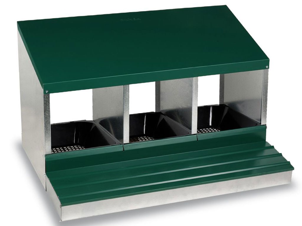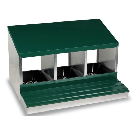 Znáškové hniezdo pre sliepky so zberným košíkom na vajcia trojmiestne , kapacita až 15 nosníc (5 nosníc na jednu kukaň), dno hniezda je spádované, vajcia sa samo odkotúľa do zberného košíka , vyrobené z pozinkovaného kovu, farba zelená . Hniezdo môžete jednoducho postaviť v kurníku na zem alebo zavesiť na stenu , veľmi ľahká údržba čistoty, rozmery: 56 cm dĺžka x 80 cm šírka x 45,5 cm výška.