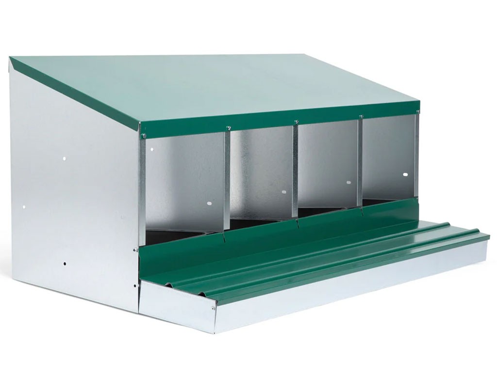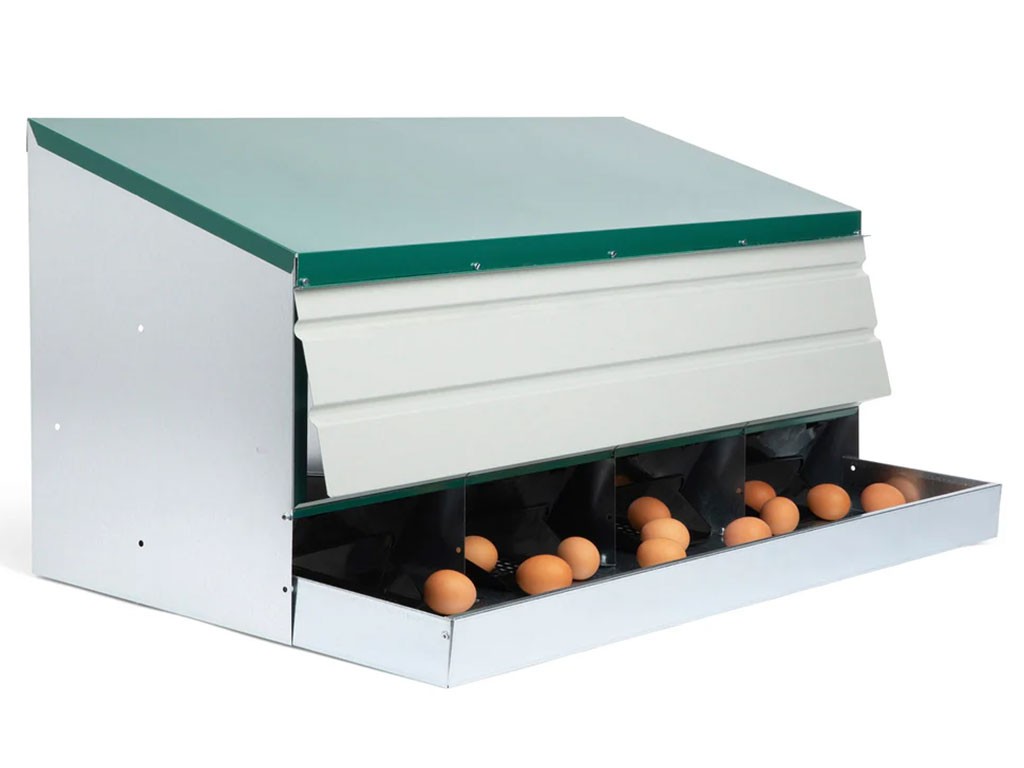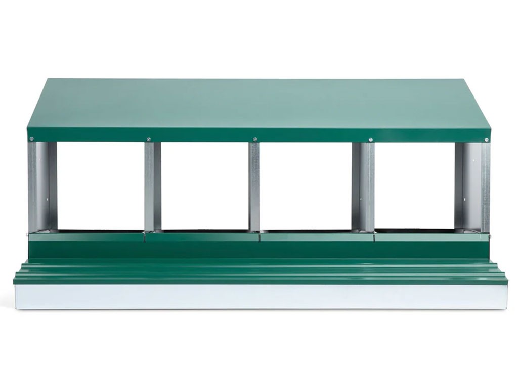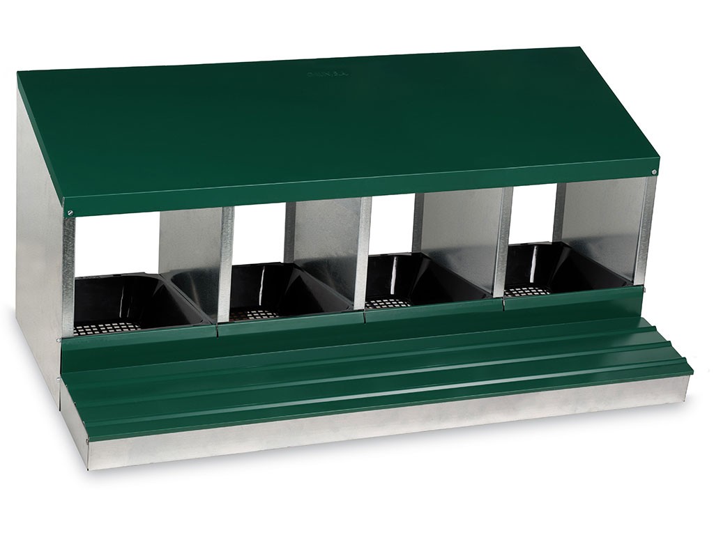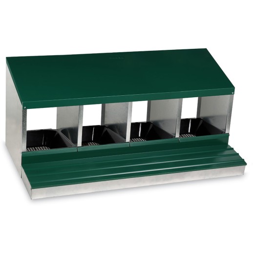 Znáškové hniezdo pre sliepky so zberným košíkom na vajcia štvormiestne , kapacita až 20 nosníc (5 nosníc na jednu kukaň), dno hniezda je spádované, vajcia sa samo odkotúľa do zberného košíka , vyrobené z pozinkovaného kovu, farba zelená . Hniezdo môžete jednoducho postaviť v kurníku na zem alebo zavesiť na stenu , veľmi ľahká údržba čistoty, rozmery: 56 cm dĺžka x 106,3 cm šírka x 45,5 cm výška.