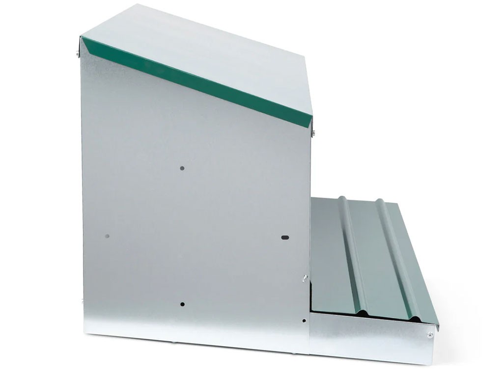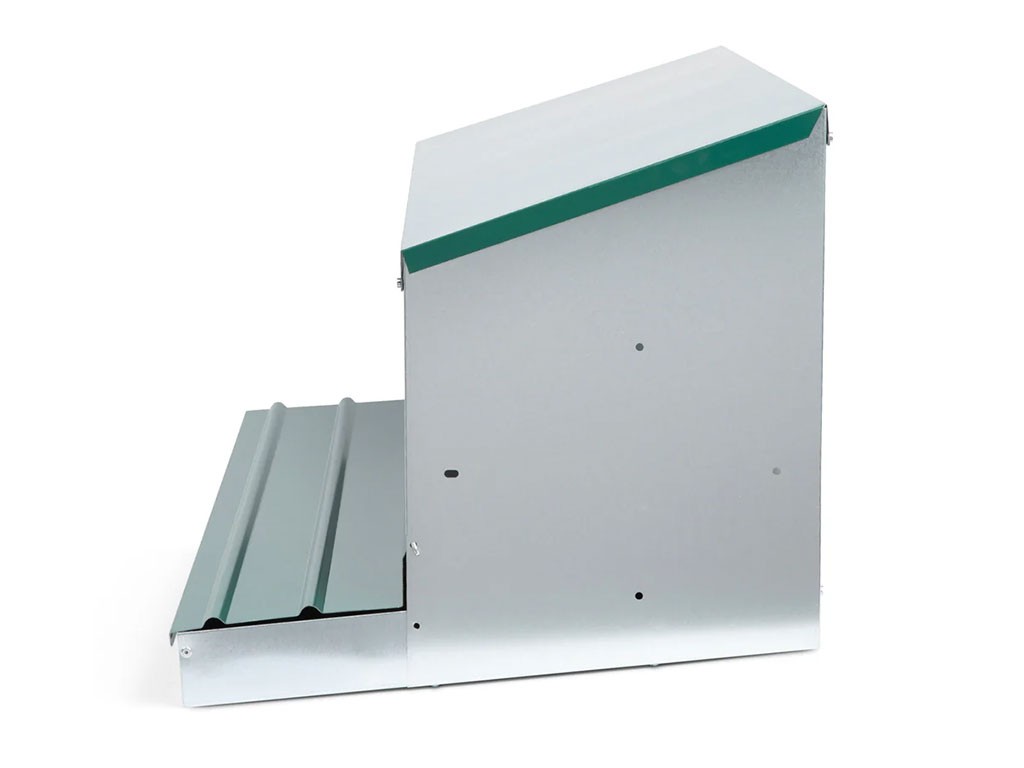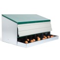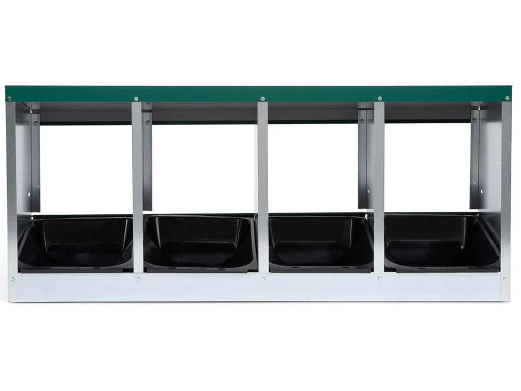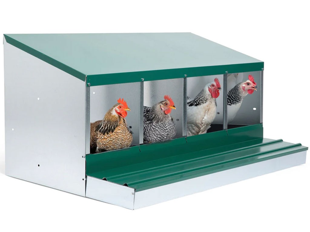 Znáškové hniezdo pre sliepky so zberným košíkom na vajcia štvormiestne , kapacita až 20 nosníc (5 nosníc na jednu kukaň), dno hniezda je spádované, vajcia sa samo odkotúľa do zberného košíka , vyrobené z pozinkovaného kovu, farba zelená . Hniezdo môžete jednoducho postaviť v kurníku na zem alebo zavesiť na stenu , veľmi ľahká údržba čistoty, rozmery: 56 cm dĺžka x 106,3 cm šírka x 45,5 cm výška.