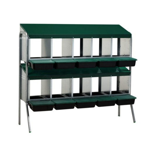 Znáškové hniezdo pre sliepky so zberným košíkom na vajcia 10-miestne na nožičkách, kapacita až 50 nosníc (5 nosníc na jednu kukaň), dno hniezda je spádované, vajcia sa samo odkotúľa do zberného košíka , vyrobené z pozinkovaného kovu s plastovým dnom, farba zelená . Hniezdo môžete jednoducho postaviť v kurníku na zem , veľmi ľahká údržba čistoty, rozmery: 52,5 cm dĺžka x 132,5 cm šírka x 121 cm výška.